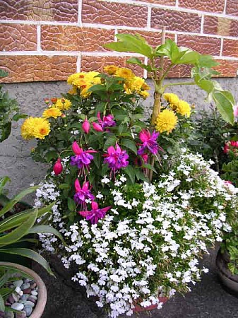 Фатсия японская, хризантема корейская, фуксия обыкновенская и лобелия в качастве фона. История создания. Куплена из жалости помирающая фатсия. Чтобы скрыть ее голенький ствол были посажены соседи - сложилась коммуналка. Так пока и живут вместе. Хорошо живут, дружно.