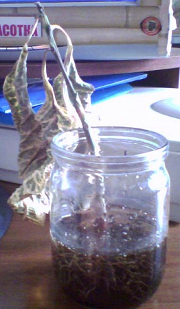 Выглядит он, кротон, - как крепыш из Бухенвальда: полуметровый полностью одресневевший (одеревеневший ?) одинокий тоненький ствол, на верхушке которого - довольно-таки крупные листья (зелено-красные) - 4 штуки. Похож, в общем, на ложную-ложную пальму (хотя нет, скорее, на облысевшее манго). Причем, два нижних листа - порванные и наполовину пожелтевшие (но еще сочные). Верхушка стебля - сломанная. Точек роста я не обнаружила. В связи с вышеизложенным - как поступить? Сразу выбросить или таки срезать верхушку и попробовать укоренить? И вообще, глобально, что делать? Нужен ваш совет по реанимации.