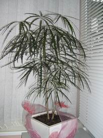 Не знаю, почему эта мысль у меня не возникла раньше, но сейчас меня волнует, что с ней делать сейчас. Можно ли её обрезать, чтобы она стала куститься. Если да, то как? Только пришпилить верхушку или чтобы был черенок для укоренения? Ствол у неё снизу стал как у настоящего дерева с корой. Станет ли оставшееся растение куститься или выпустит один побег? А как укореняется обезанный черенок? В инете читала, что нужны гормоны для укоренения и подогрев. У подруги черенок дизиготеки стоял в воде год(!?), но так и не укоренился. Правда, и сам не загнулся. Словно в кому впал. Не хочется совершать ошибок. Может, вообще, не заморачиваться и оставить все как есть. Тогда как долго он сможет расти, не теряя листву снизу ствола?