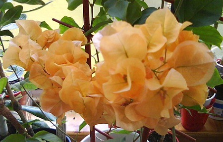 Немного группой(кусочек балкона)...по ходу, мобильник на таких мелких фоках вполне справляется.... Это не всё, что цветёт, но перестановкой горшков заниматься сегодня не буду...Тай Голд, цветущую малышку, испортила опрыскиванием (опрыскивала рядом стоящий гибискус от клеща)- цветы покукожились, почернели, красная махрушка какая-то бледная и немногоцветковая на этот раз, оранж. буги недорастянулись и надо резать , дылды, у остальных прицветники ещё совсем мелочь...... На первой и треьей фотке Леди Мари Баринг "утоплена" вглубь, а Калифорния Голд , наоборот, стоит ближе, поэтому реальные размеры можно скоррелировать...Белая Буга и Калифорния Голд - почти одного размера цветки, ну, может, у белой самую малость мельче...