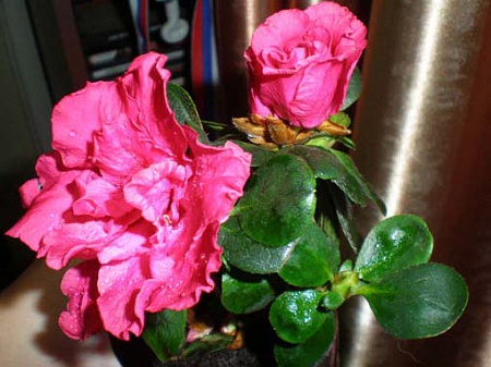 Привет, девочки! Показываю обещанные фото. Вот такая была у меня азалька при покупке, цветов много, листьев мало и залитая по самые уши, я ее не поливала после магазина почти неделю