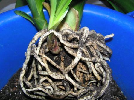 Когда корни уже заполнят горшок и вылазят через дренажное отверстие