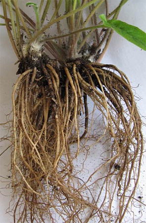 Гербера (Gerbera). Ползучее корневище, соединяющее два куста уже разломлено пополам. Корни довольно твердые и упругие.