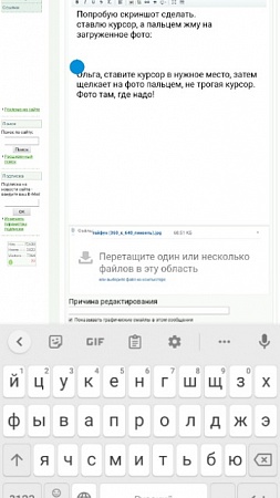 Ольга, ставите курсор в нужное место, затем щелкаете на фото пальцем, не трогая курсор. Фото там, где надо! Скан с экрана телефона: