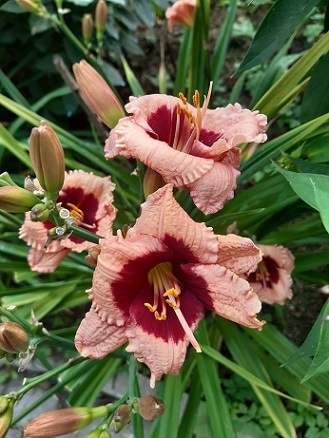 17. DARKER SHADE (Stamile, 1992, 15/70см), темно вишневый, бутон черный, 300р; 18. ELEGANT CANDY (Stamile, 1995, 11/64см), Розово-оранжевый с темно-красным ободком вокруг зеленого горла классический сорт, цветет в любую погоду, 2 веера 250р; 19. AERIAL APPLIQUE (Lambertsоn, 2007, 16/80см), длиннолепестковый, лавандовый с фиолетовым гало и желтой аппликацией вокруг зеленого горла, 400р;