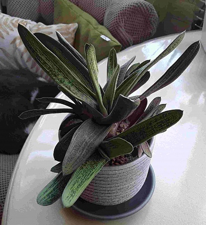 5. Burmanica 1500 взрослое растение с 3 стволами и цветоносами. Перевалю в транспортировочный горшок, без лесенки. Очень интересные листочки с шелковистым отливом.