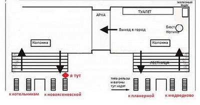 Буду стоять с 17-40 до 18-30 внизу лестницы, дальней от «головы» (бюст В. П. Ногина), которая ближе к выходу в город. Если спускаться к поездам, по левой стороне, смотри схему, красная точка. Стою сразу, как заканчиваются ступеньки. Опознавалка - черно-белая сумка, бейдж.