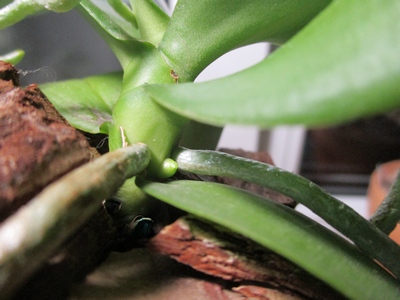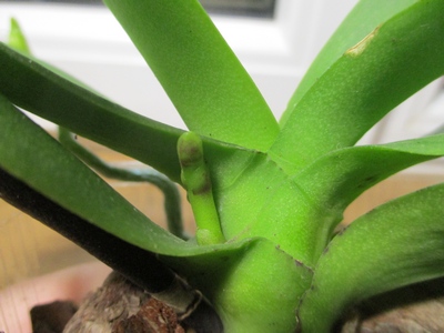 Phalaenopsis желто-неоновая мультифлора – 750 некрупный цветочек яркой окраски, проклюнулся цветонос, не нашла название, на нижнем листе старый отек, не мешает