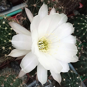 Тело и колючки похожи на лобивию. Кактус 5,5 х 5 см. Цветок 9 х 10 см. Три ряда лепестков белого цвета. Аромат не ощущается.