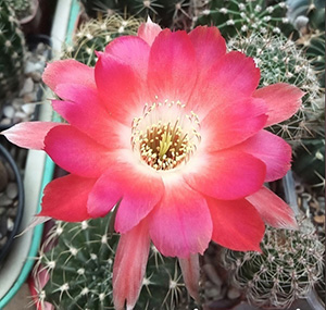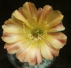 Кактус шаровидной формы, зацветающий в достаточно молодом возрасте. Эпидермис тёмно-зелёного цвета, колючки ничем не примечательны. Цветок оранжево-розоватого цвета. На широких лепестках заметны разводы, штрихи цветовых оттенков. Продаётся неукорененная детка 1,8 x 2,3 см - 550 р