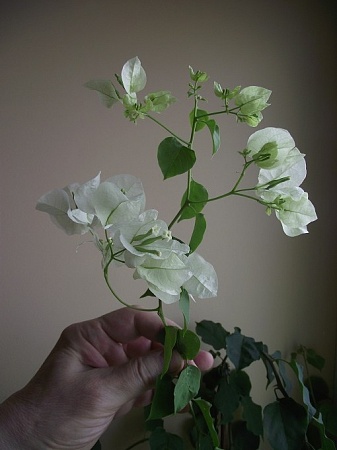 2. Бугенвиллия Mrs. Alice № 1 и № 3. 1-я в 300-г стакане. № 3 - 100 р. в 400-г стакане. Надо пересаживать. У № 3 из отверстий лезут корни. Белые прицветники. Букетное цветение. Фото цветения мамки прилагаю.