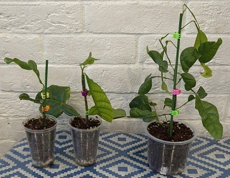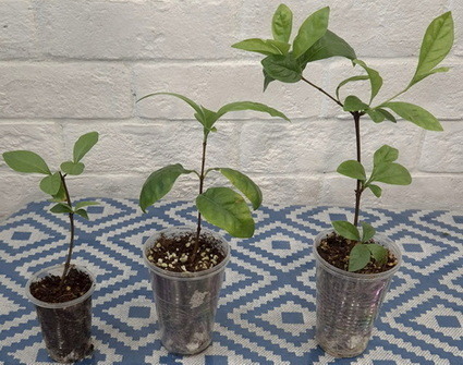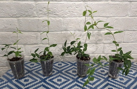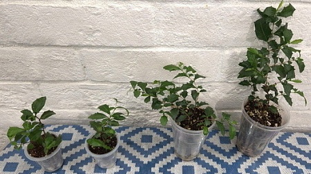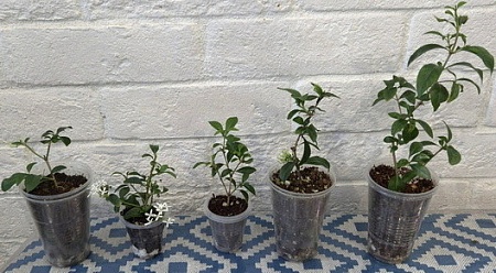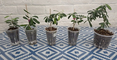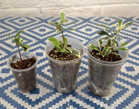 Черенки в стаканах 200 мл, 2500-3500-4000, средний и правый- с бутонами. Правый- с несколькими проснувшимися боковыми ростами: