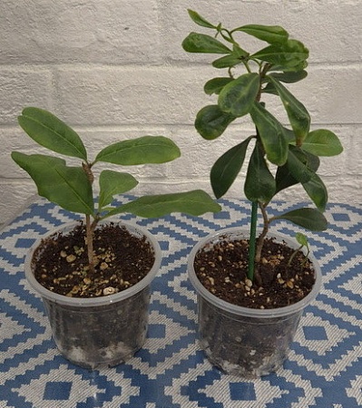 Справа - брунфельсия ундулата, прошлой весны укоренения, выросла раза в три, уже идут прикорневые росты. Хлорозила, новый рост полностью зеленый, 1500 Kislica