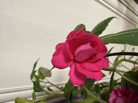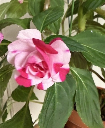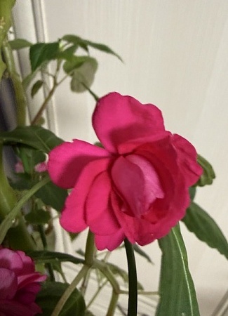4. Бальзамин цветет розовыми розочками, сорт рослый, цветение яркое