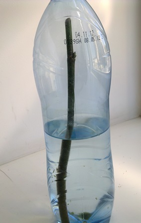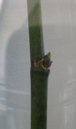 Доброго времени суток! В начале мая, с фаленопсиса, находящего в реанимации с целью отращивания корней, в связи с тем, что он стал погибать, были срезаны остатки цветоносов с проснувшимися почками (почки проснулись в марте) и помещены в пластиковую бутылку с погружением концов(на 1,5-2см) в воду+активированный уголь.