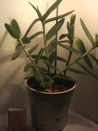 у меня растет. Самое странно существо в коллекции. Просыпается только в конце сентября, до января растет, потом опять впадает в спячку до осени. Бульбы мельче, чем те, с которыми я его купила. В этом году вырастил цветонос, но закуклил бутоны, а я слишком поздно это заметила- на молодых ростах у этого эпидендрума много липкого секрета, который буквально приклеил бутоны к чехлу.