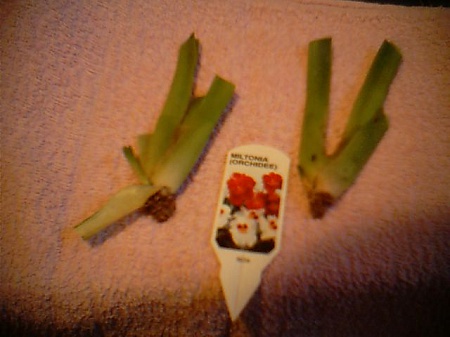 Не нравился мне вид мильтонии, которую мне не так давно подарили. Вытряхнула из горшка - а там корни почти все сгнили. Я, как на форуме прочитала, корни обрезала, промыла, углем еще присыпала. И подготовила плошку с влажным сфагнумом и место в тепличке, чтобы ее туда поместить. Но меня терзают смутные сомнения, т.к., кроме сгнивших корней, наблюдаются и другие проблемы: мелкие темные пятнышки кое-где на листьях, лист один "гармошкой", на бульбах тоже какие-то пятна, похожие на загнивание. Вобщем, нужен совет, нужно ли еще что-то сделать, может, препаратом каким-то обработать, или еще что-то, или принятых мер будет достаточно. Фото №1. Общий вид.