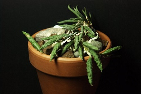 Собрав всю эту информацию, пришел к выводу, что самый оптимальный способ посадки это блок. Выбор пал на робинию (белая акация), кора у нее воздушная и при этом вбирает в себя влагу и потом постепенно ее отдает. Подложку из мха не делал, так как после полива корни должны очень быстро просыхать, во мху же они очень быстро загнивают. Проблема с зимнем солнцем была решена (хочу сказать, что люмицентные лампы с лихвой смогли заменить солнце), тем что данную орхидею подвесил во флорариум, под самой лампой, расстояние от ламы составляла 15 см. Поливал с помощью опрыскивания, в зимнее время скудно и хотя в это время было положено понижение температуры, но у меня она там не опускалась ниже + 24 С. С наступления тепла, орхидея плавно переселяется у меня на южное окно, где начинаю ее опрыскивать в утренние часы. Нужно отметить что за 2,5 года жизни у меня я ни разу ее не поливалась путем замачивания, только орошением из пуливизатора. Цветение происходит из хорошо вызревших бульб , после периода покоя, период цветения приходиться на весну-лето."