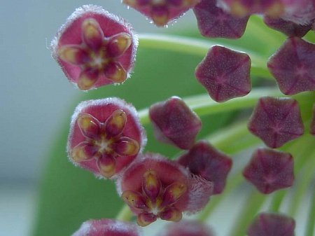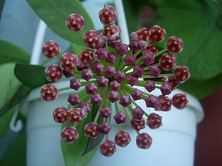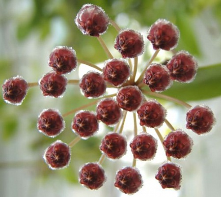Только что отцвела грацилис. Это единственная хойка, которая цвела у меня в эту жару. Цветы держались не долго - несколько дней, запах слабый, ощущается только когда сунешь нос в корзинку . Цветоносы располагались и наверху, у основания хойки, и посередине, и в самом низу, на лысой плети. Фотки без вспышки, так лучше виден натуральный цвет цветочков: