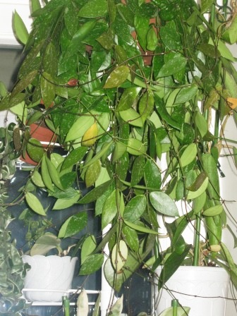 Расцвела Hoya Gracilis. К сожалению случайно заметила когда поливала цветок. Хорошую фотографию нет возможности сделать, т.к. эта хойя разделяет горшок с лакунозой и в длинну все плети чуть больше метра. А расположен горшок под потолком.