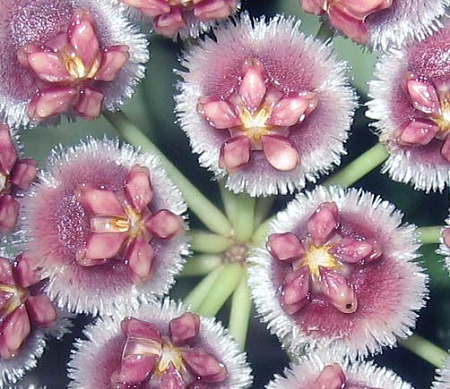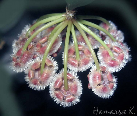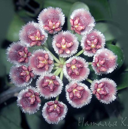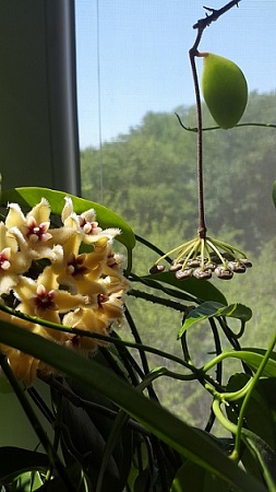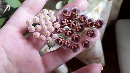 С цветоносами уже год точно сидит, но бутончики совсем махонькие вечно отсушивала и сбрасывала. И, скорее, я этому процессу усиленно помогала, т.к. хойка долгое время неудобно стояла на краю подоконника и вечно норовила оттуда слететь при любых моих манипуляциях. Когда я её переставила в более "безопасное" место и перестала тормошить, снимать/переставлять при поливе и пр., чтобы дотянуться до дальше стоящих, неожиданно распустилась. Как обычно, заметила уже с распушенными цветочками, долго не могла налюбоваться и успокоиться от восторга