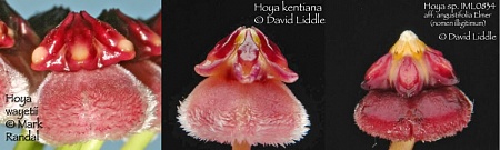 Hoya kentiana и Hoya wayetii это разные хойи. Отличие - в форме короны, на сколько я помню. Ну и листья немного отличаются тоже, у вайетти они шире. А вот Hoya globulosa и Hoya villosa считаются синонимами, и правильнее называть Hoya globulosa, так как это имя было зарегистрировано раньше. Цветение идентичное у обеих, есть различие в листьях. У виллозы они более фактурные.