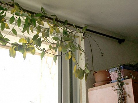 На ярком прямом солнце могут подгореть и пожелтеть листья. Или утратить яркую зелень окраски с уходом в желто-зеленый цвет. Не только у карнозы, но и у других хой. Даже с довольно плотными суккулентными листьями. Солнце есть солнце. Но при этом они желтеют там, где падают солнечные лучи - т.е. сверху, сбоку, где угодно. Если пожелтение листьев идет снизу побегов, а верхушки остаются зелеными, то тут больше похоже на проблемы с корнями. Желтеть могут в равной степени как от потери корней от залива, так и от пересушки.