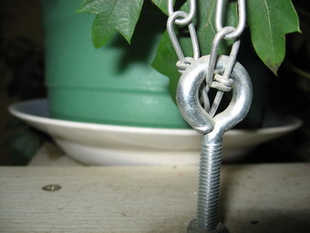 Конструкцию я заказывала, в потолке выстверливаются дырки по размеру крепежа. Потолочные крепежи я покупала в магазине, где продаются гвозди, шурупы, в общем все для ремонта. Такие крепежи идут уже с крючками. Крепеж на саму конструкцию и цепочку покупала там же. Лампа, действительно в середине квадрата, у меня обыкновенный светильник с тремя лампами накаливания по 60Вт, рассмотряние до ламны около 20-25 см. Но все-таки света маловато, особенно, на стороне, где нет окна: там у меня только плющ, циссус и нефролепис стоят. На стороне, где окно стоят два сцидантуса, филодендрон и монстера ампельные и пеперомия. Но для полного счастья растюхам все-таки надо наверх люмки- сейчас я думаю- как условия освещения улучшить. Сделала фотки деталей: