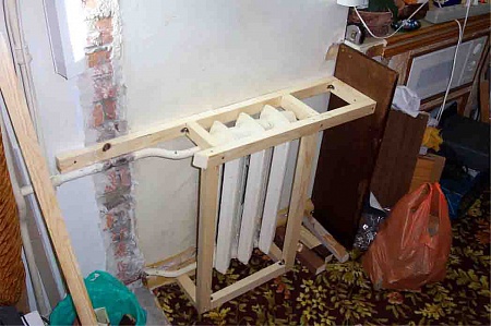 Ну это громко сказано - поставил лампы, электрика еще полностью не сделана, правильнее сказать - привесил "на гвоздик" - нельзя же оставлять "зелененьких" без света. По ходу дела появилась проблема, точнее она - проблемная батарея - всегда там была. Поначалу хотел снести ее, но жена уговорила оставить, просто частично закрыть. Закрыть сверху полностью и с боку частично, сделав вывод теплого воздуха снизу, из-под водопада. Так получается и воздух не сушится вокруг растений и тепловой подогрев снизу, как они любят, ну чтобы корни в тепле.Использовал обычный брус и не большие уголки для соединения