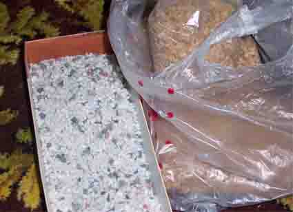 Мелкая цветная щебенка для аквариумов, у нас продается по 30 руб за пакет по полкило(брал белую и песочного цвета и смешал). Сначала хотел сам набить мелочи из камней, но когда увидел, что продается в зоомагазине,то стало понятно, что китайская щебенка и красивее и дешевле, чем самому-то камни колотить