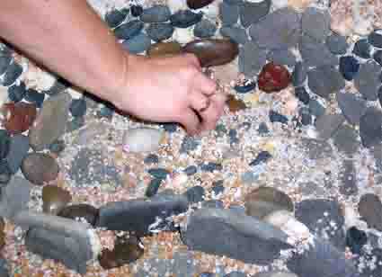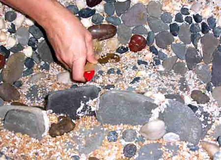 И слегка утрамбовывали щебенку кисточкой.Щебенка мелкая, излишки потом собрали, но не все, так как она все равно лежит на дне и не большое ее количество в свободном виде (не приклееном) делает дно тазика более "природным".