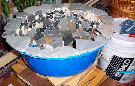 Вот со вторым тазиком пришлось повозиться по-дольше. Все из-за того, что надо было сделать излив, по которому вода будет переливаться в нижний тазик. Сначала думал просто выгнуть эту часть тазика нагревом, но потом понял, что не стоит тазик подвергать этому тепловому "истязанию", да и жена засомневалась, "а вдруг он потом из-за этого треснет". Ну не расстраивать же свою половинку. Стал думать, как бы выкрутиться...Решение конечно не бесспорное, но зато простое. Взял коробочку из-под мороженого. Срезал ее бортик, а он как раз с изгибом, как надо. Подрезал тазик и при помощи холодной сварки (продается в любом сантех магазине, служит для склеивания разных сантех деталей, ну это в общих словах)приклеил бортик в вырез тазика. Я еще не декорировал внешнюю сторону тазика и тут видно как и в каком виде приклеен излив к тазику.Всю поверхность излива так же оклеили щебенкой. В кадр попала наша помощница. Она активно участвует в создании водопада.