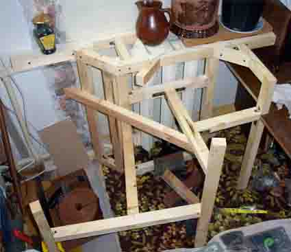 Тазики + вода = вес. Поэтому опоры стали делать по возможности надежные и позволяющие потом тазики вынуть с подставки. Конструкция определялась размерами тазиков, не буду описывать каждую опору, вот в общем такая схема оказалась весьма устойчивой и сама не добавила лишнего веса.Брус обработали пропиткой,но это скорее по настоянию жены, так как сам брус с водой не соприкасается, то это уже скорее излишество, чем необходимость.Сборку делал на те же уголки шурупами, что и ранее. Важно учесть, чтобы под дно тазиков приходилась надежная крестовина из бруса.