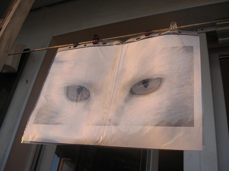 Последней каплей стала "летающая крыса", усевшаяся на поддон с литопсами. Вспомнил статью из какого-то старого садоводческого журнала, про отпугивание птиц с помощью рисунка кошачьих глаз. Распечатал найденное в сети фото. Если используется струйный принтер - лист необходимо заламинировать или заклеить в файлике. Для веса, чтобы не сильно мотало ветром, положил в файлик болт. В первый же день, несколько раз слышал хлопанье крыльев птиц, в панике метнувшихся назад при попытке сесть на ограждение.
