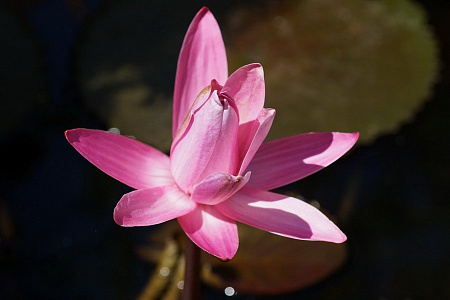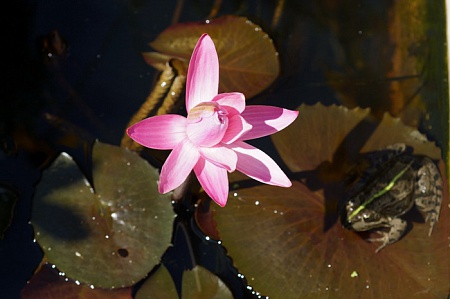 Свершилось! Моя нимфея зацвела. Но вот незадача: я никак не могу "поймать" ее в полном роспуске! Вчера перед работой около 9-00 утра она была в полуроспуске. Вечером около 18-00 - плотно закрыта. Сегодня в 11-30 - в полуроспуске, в 13-30 - плотно закрыта!!! Когда я ее смогу разглядеть? Они все так мало бывают открыты???? Очень хочется ее "опознать", чтобы подстроиться под ее требования. Пока на основе увиденного (пурпурные листья, зеленеющие с возрастом и розовый оттенок цветка) решила, что это Rose Arey, а значит не тропическая.