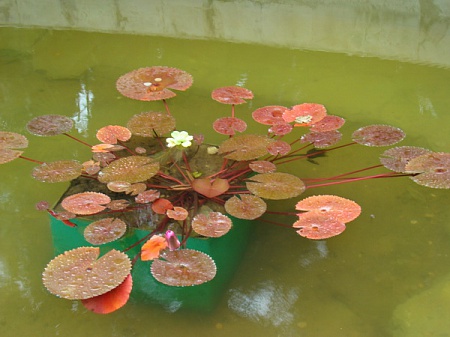 А у моей нимфеи "на воле" стали расти нормальные по размеру листья! Первые три-четыре выросшие на вольных хлебах еще были сантиметра по 3-4, а потом как стала выдавать лопухи! Половина ванны ими уже заполнена. Так что карликовыми им не быть