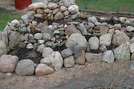 Песок -10-15 см. Потом обкладывали внешний периметр старыми кирпичами (рыхлая кладка - на фото видно), засыпали землю в центр. Кстати, внутри, там где самый высокий ярус тоже докладывали перемычку из кирпичей. Потом выкладывали ярусы пластиковыми перегородками (из-за нехватки камней в то время), их закрывали мелкими камнями. Периметр обкладывами уже крупными - главное, чтобы не было видно кирпичей и старались стенки сделать более отвесными.... вот вроде и всё...