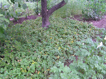 А еще как у Lusi есть ковер из желтой садовой земляники. Земляника лучше усатая, тогда она затянет весь приствольный круг и останется только урожай собирать. Но сорняки, предварительно надо прополоть!