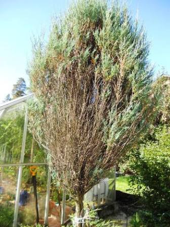 Зеленые веточки только на концах побегов и на самой верхушке!Все остальные-засохшие..Особенно это проявилось в этом году,раньше подсохшие ветки тоже были,но не в таком количестве!Сзади (с северной стороны)он вообще выглядит ТРУПОМ..Но ведь он жив!
