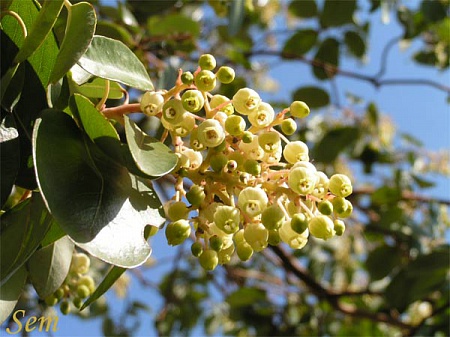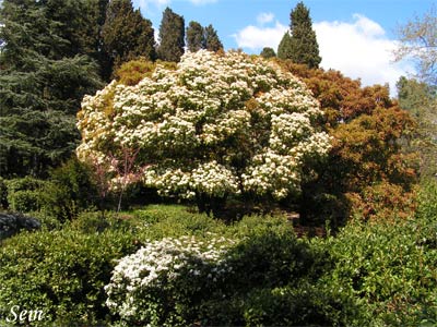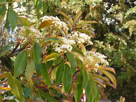 Ну что, гуляем дальше… Следующий интересный ботанический экземпляр встреченный на пути это Photinia serrulata или Фотиния пильчатая. Огромное вечнозеленое дерево покрытое шапкой белоснежный цветов, издающих своеобразный запах. Не приятный и не неприятный. Просто запах, который теперь у меня всегда ассоциируется с запахом фотинии. Вот так я и вышла на нее. По нюху. Где тут так странно пахнет? Тут? Тут? Тут! Жаль, но к сожалению эта красавица слишком теплолюбива и -20 она вряд ли переживет…Хотя с другой стороны, читала на нашем форуме, что ее успешно выращивают в Одессе…