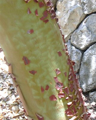 А вот и мой любимый Arbutus Andrachne, он же коралловое дерево, красное земляничное дерево или же просто земляничник мелкоплодный. Добрые люди его прозвали еще и деревом-курортником, когда в начале лета он начинает сбрасывать свою тонкую красновато-коралловую кору, которая растрескивается и лоскутками опадает, а взамен появляется новая, зеленого цвета, уж очень это напоминает обгоревшие на солнце тела некоторых отдыхающих. Но на самом деле в это же время происходит и смена листвы, вот тогда эта молодая зеленая кора и берет на себя функцию фотосинтеза. Потом отрастают молодые листочки, а кора постепенно розовеет (ну чем не курортник на второй неделе отдыха), а к осени снова приобретает этот богатый красновато-кораловый цвет. Жаль, что весь процесс мне так и не удалось пронаблюдать от начала до конца. Но не верить рассказам местных жителей нет причин.