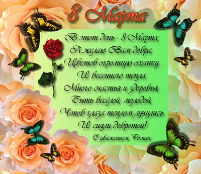 Дорогие наши женщины, позвольте поздравить Вас с весенним праздником 8 Марта! Пожелать Вам крепкого здоровья, счастья в личной жизни, больших успехов во всех делах и начинаниях, и пусть всегда цветут цветы не только в садах, но и в Ваших душах!