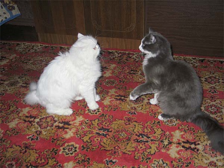 А у меня вообще 2 кота и собачка-девочка. Они очень любят друг друга. Все ходят в один туалет, правда перс, в основном, ходит в ванну. Кушают вместе с разных тарелок, т.к. перс "Марсик" ест сухой корм, ангорский "Яшка" ест только мясные кусочки в желе, правда Марсик вылизывает желе из Яшкиной тарелки, но все это без инцидентов. А собачка "Дуся" таскает из обеих тарелок. Они даже сами ей всегда немного оставляют. Я думаю, дело во времени и в Вашем отношении к этой проблеме, Вы должны любить одинаково обоих и всегда объяснять "малышу" что он не прав (ведь они все понимают...) Вот мои красавцы!