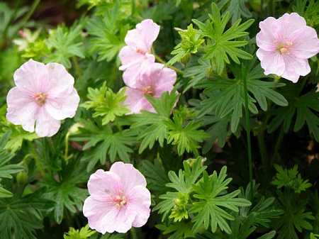 Герань стриатум, легкий, ажурный шарообразный кустик, высота ок. 40 см (на моем песке:), нежные розовые довольно крупные (ок. 4 см) цветки. Декоративна в течении всего сезона - осенью оранжево-красная листва. Очень неприхотлива.