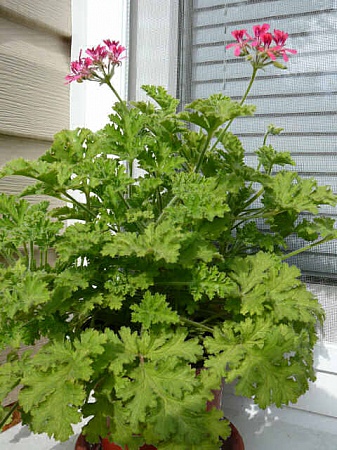 это душисая герань! Хорошо сформированный кустик. Достаточно света и он даже процвел!