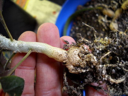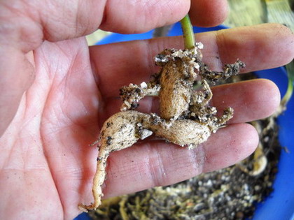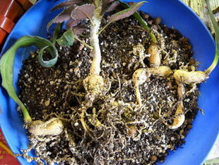Года четыре-пять назад я начал активно интересоваться каудексными эуфорбиями. Покупал и маленькие, и большие. Пылил цветущие экземпляры между собой, чтобы получить семена и уже из них вырастить свои экземпляры. Решил попробовать вырастить эуфорбии и из укоренных листочков. Было это пару лет назад. Как раз пересаживал эуфорбию франкоизии и решил снять с нее несколько нижних листьев. Подсушил пару дней, затем посадил в землю в горшок. Поставил в теплицу в дальний угол, чтобы не мешались и ... забыл. Изредка вспоминал, поливал. А с год назад случайно заметил, что в этом горшке вроде что-то растет. Вытащил из дальнего угла и увидел, что из грунта растет новая эуфорбия. Т.е. листок дал поросль. Пересаживать эуфорбию не стал, т.к. она была еще маленькая. А вот с пару недель назад вытряхнул горшок и увидел вот это.