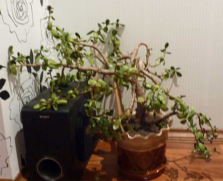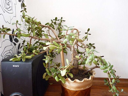 Толстянка просто гибнет. Стволы стали мягкими. Листочки еще желтее и суше