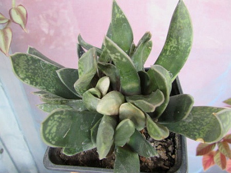 После таких красавиц моя скромненькая не сделает погоды,но люблю её, и как кристатка (как сказали при продаже) она мне интересна. Явного гребня пока нет, но нет и главной "мамы" и боковых деток, а точки роста появляются между парами листьев, иногда по две (как видно на первом фото). Год назад, когда купила, было три точки роста, теперь - семь. Однако, наверное, правильнее будет сказать, что это не кристатная, а монстрозная форма, так как кристатка все же предполагает наличие гребня, а монстрозность может иметь раные формы. На фото - моя Gasteria gracilis f.monstrosa, теперь правильно Gasteria obliqua, по сведениям, предоставленным Tsur (спасибо!)
