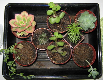 Aeonium Kiwi розетка, Graptopetalum bellum, Sedum pachyphyllum, Senecio rowleyanus hybr. и Портулякарию (денежкино дерево).