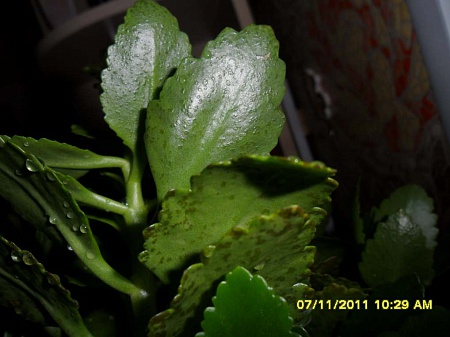 Растению год,на цвету. Шершавые пятна постепенно увеличиваются. Полив ограниченный, не опрыскиваю вообще (на фото капли воды после промывки х/м). Что это?